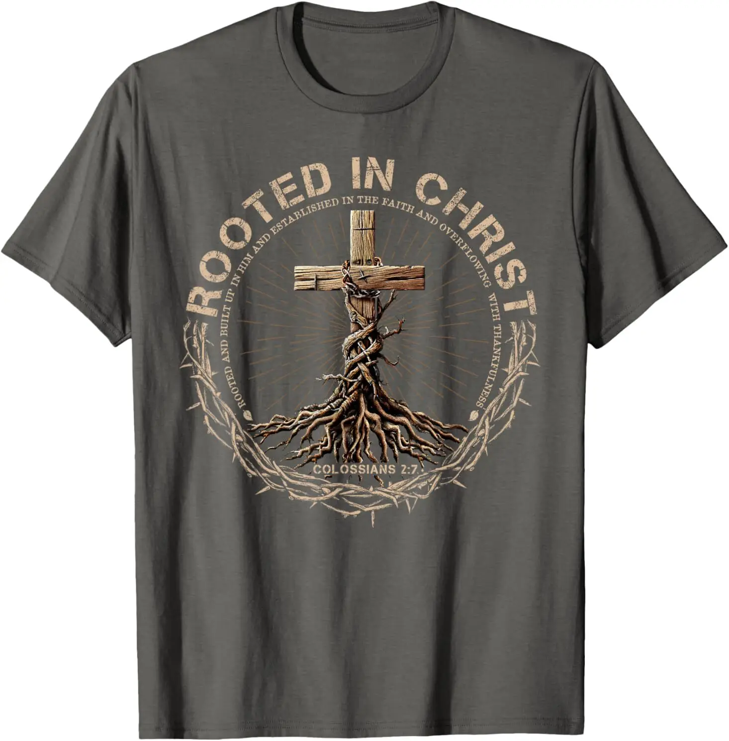 T-Shirt Chrétien Homme “Rooted in Christ” – Colossiens 2:7 – Tee-Shirt Foi Masculin du S au XXXL (Bleu, Rouge, Noir, Gris)